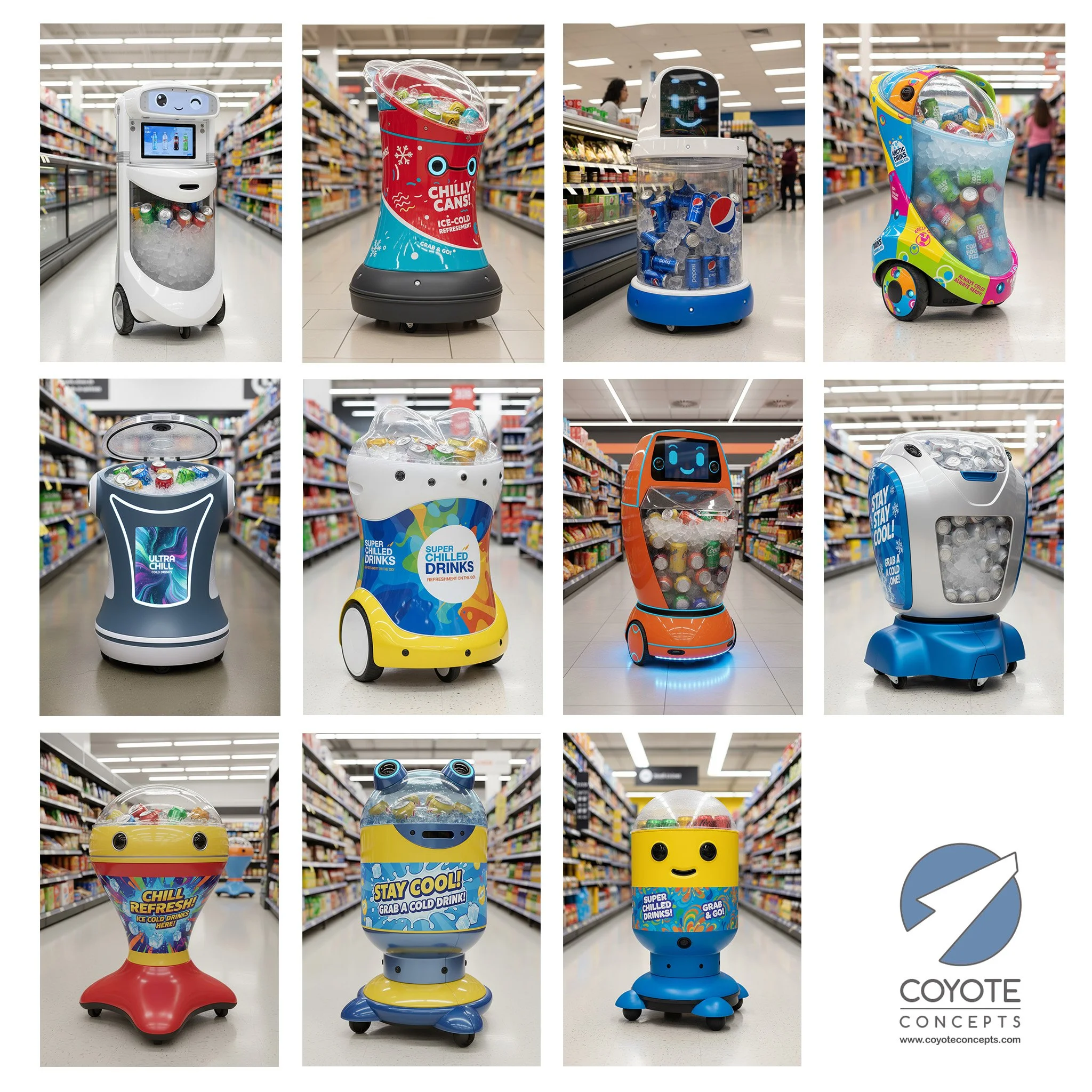 “Render this sketch concept of a colorful robot that is designed to merchandise cold drinks in a store. It would feature body consisting of an ice bucket with a clear lid that would hold canned beverages. There would be colorful generic branding on the exterior referring to the cold beverages inside. Wheels under the base skirt, which also functions as a bumper, allow it to move about the store.” The remaining prompts evolved with each successive attempt as I learned what I needed to add or subtract to improve my results.This resulted in my last prompt: